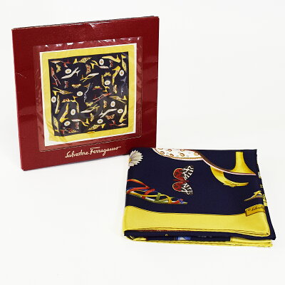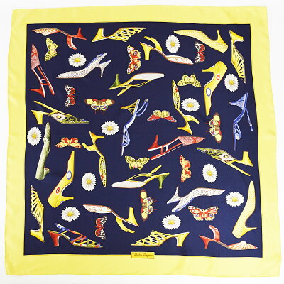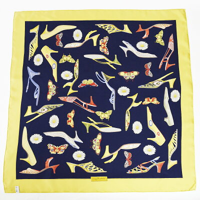 Salvatore Ferragamo サルバトーレフェラガモ シューズモチーフ スカーフ ネイビー×イエロー【送料無料】【代引き手数料無料】 レディース ストール 紺 黄色 【中古】31630802