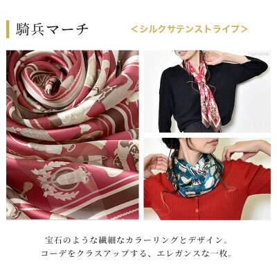 シルク スカーフ 日本製 サテン 大判 正方形 ブランド おしゃれ シルク 100% 横浜スカーフ オフィス 仕事 赤 ネイビー グリーン 緑 騎兵マーチ 女性 妻 嫁 プレゼント